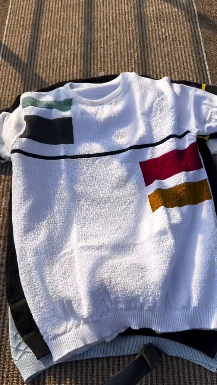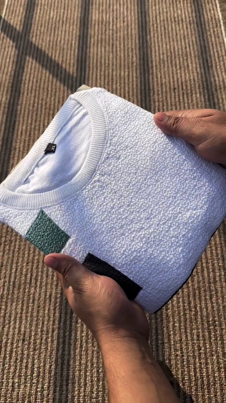 White, black geometric printed pullover ,has a round neck, long sleeves, ribbed hem