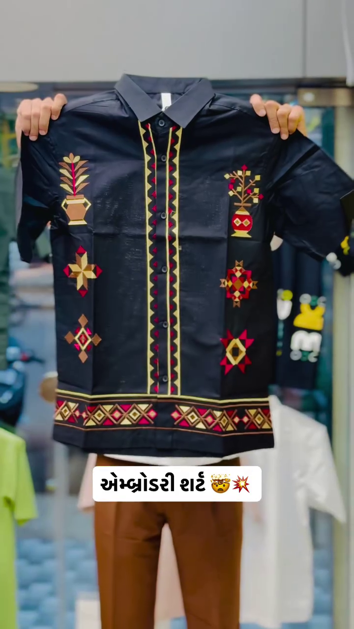 - ARTISTIC TRIBAL EMBROIDERY: Make a bold statement with intricate multi-color tribal motifs embroidered across the full front of the shirt. This detailed, artistic design, featuring prominent mustard and dark green hues on a black base, elevates the garment from a simple shirt to a unique, wearable piece of art that showcases your distinctive style.